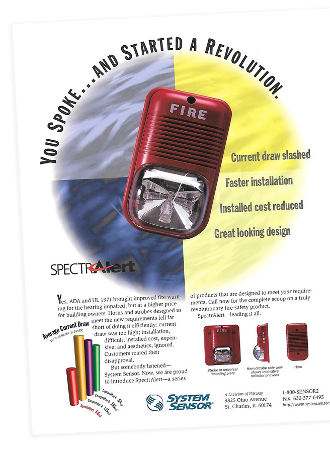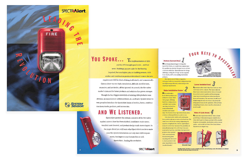 System Sensor is one of the world's largest manufacturers of fire detection products. Back in the 90s we created the logo that System Sensor still uses today. Soon afterwards, when System Sensor was ready to introduce a new product to the market, they came to us for help. They had designed a new alarm system, but it needed a name. We called it SpectrAlert. We designed ads and brochures to launch the product into the global market.
