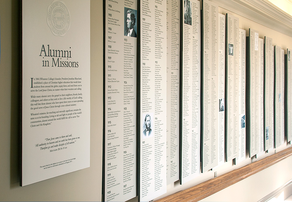 Located just outside the president's office in Blanchard Hall, the Alumni in Missions Wall tells the story of Wheaton's missional legacy. The timeline includes hundreds of names of Wheaton graduates who dedicated their lives to missions.